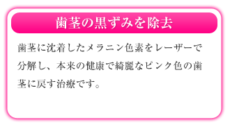 黒ずんでしまった歯茎は、レーザーを使うことで、もとの綺麗なピンク色の歯肉に戻すことができます。