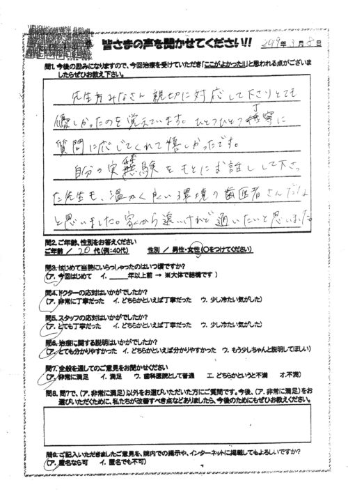 歯周病治療(越谷市宮本町在住) Posted on 2019年3月26日 by parasion8020 以前通院していた所に不満はなかったのですが、高齢になりパラシオンさんが自宅のすぐ前と言う事と、先代の先生、奥様の時、お世話になった事を思い出し、通院させていただく事にしました。 今後の治療の説明が 分かりやすく、安心して、受けられると 思いました。 これからも宜しくお願い致します。